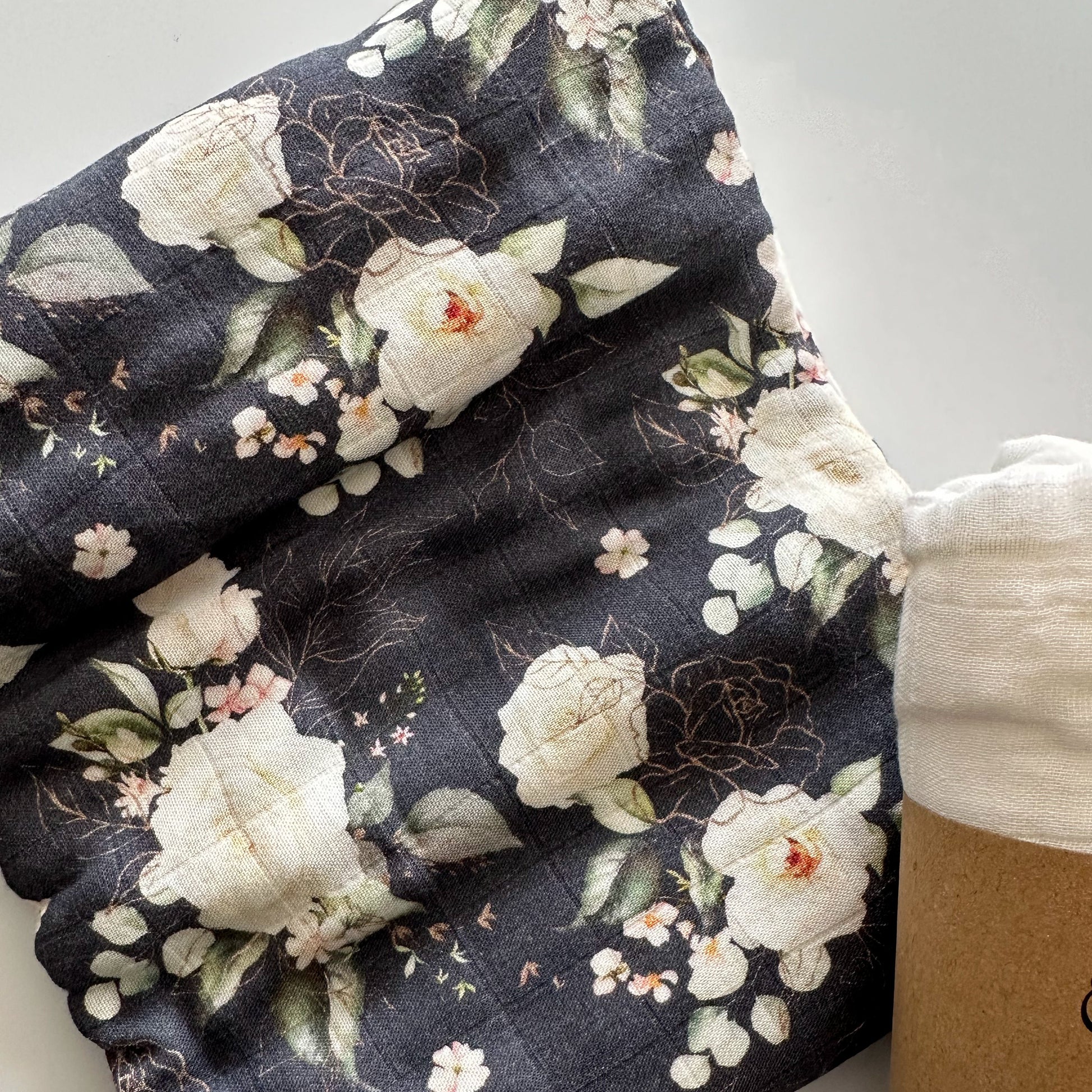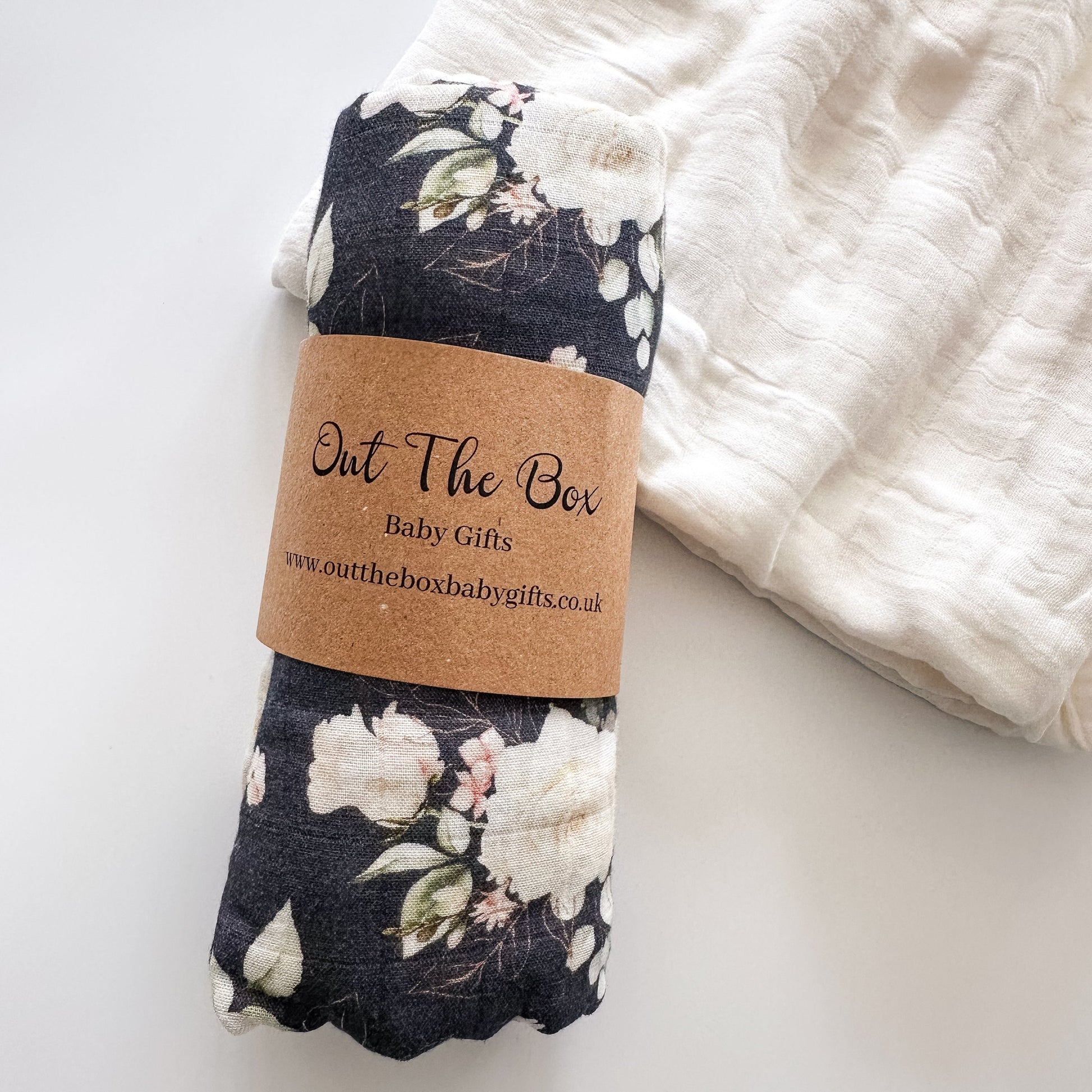 This gorgeous 2 pack of dark floral muslin and solid white muslin ensures safety and comfort while its multifunctional feature allows it to be used as a swaddle, burp cloth or lightweight blanket.