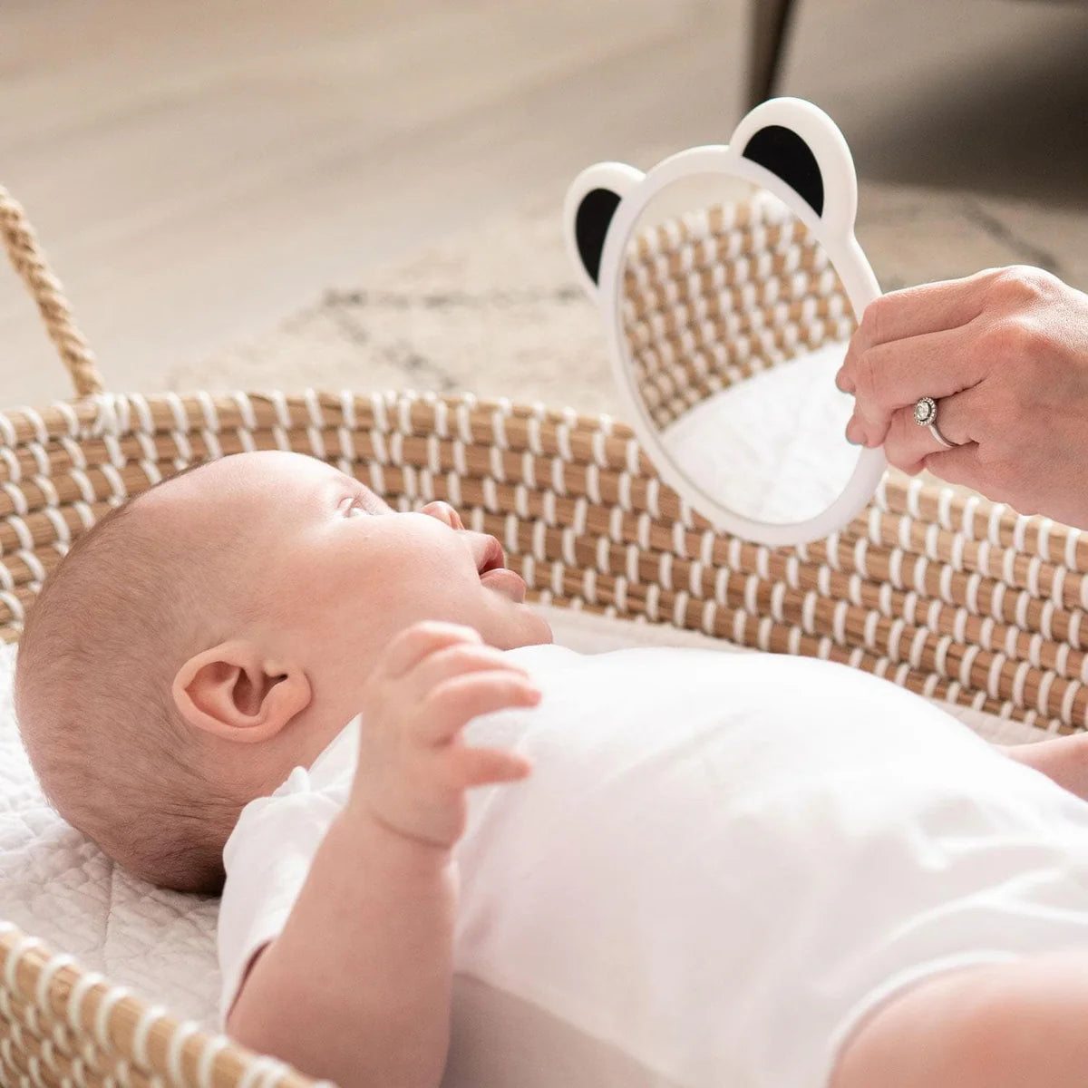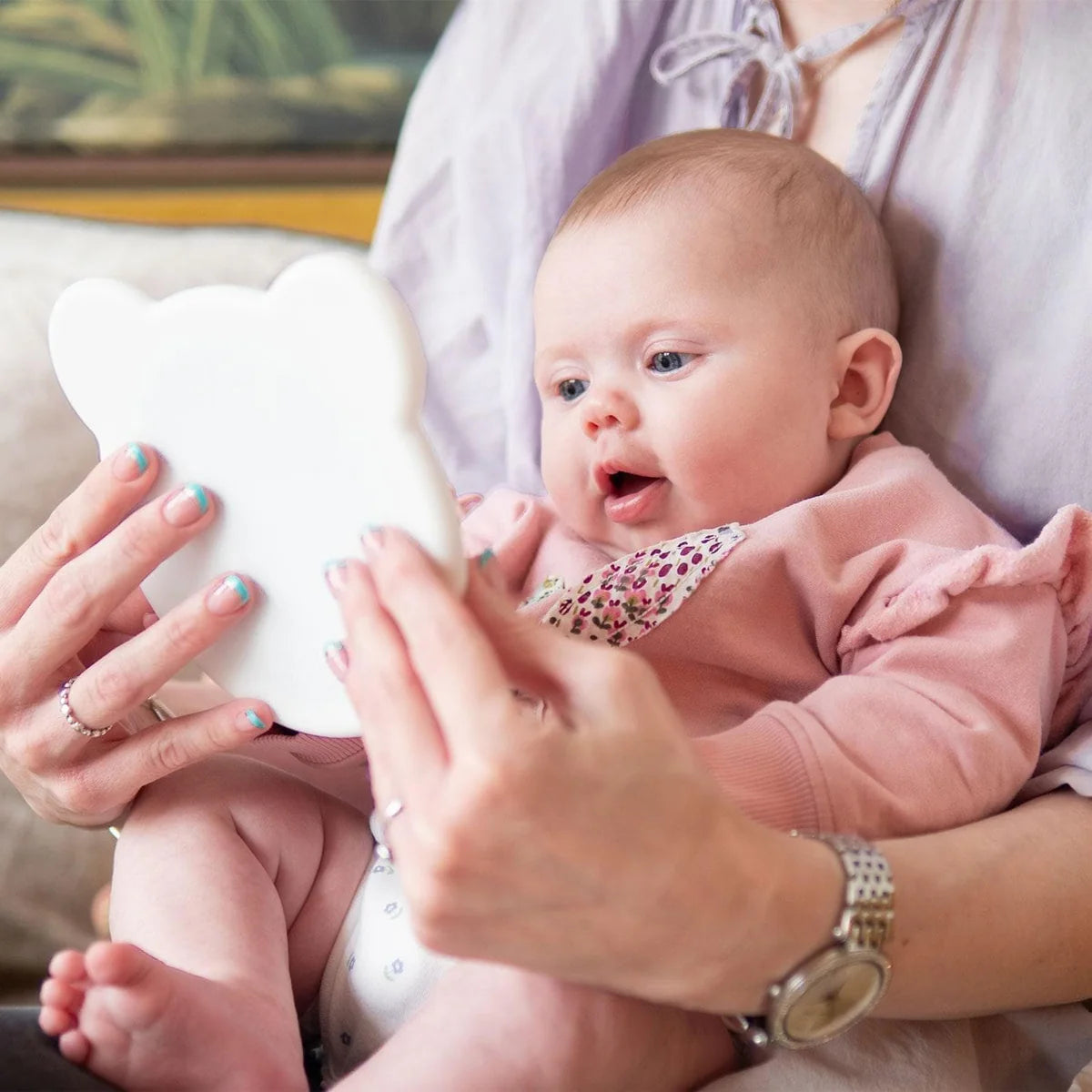Mirror play isn’t just entertaining for your baby but is also pivotal in their development too. Over the months you will notice your baby becoming more self-aware, from looking at themselves to understanding, smiling and engaging with their reflection to even pointing and touching their face once old enough.