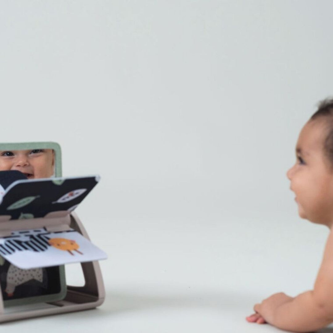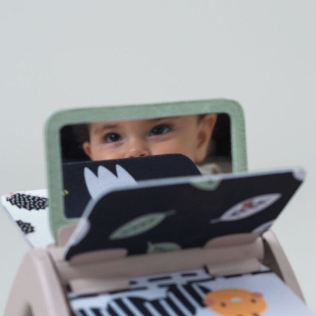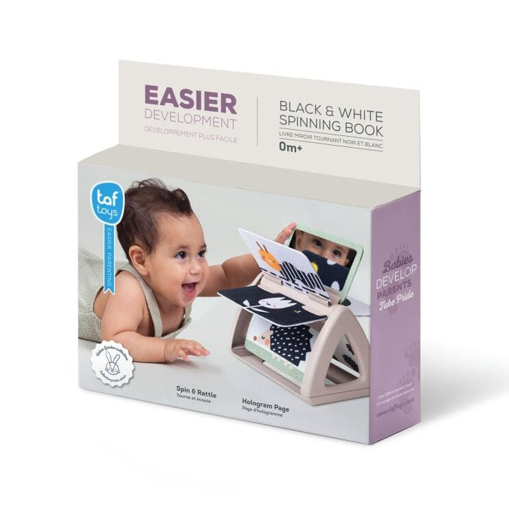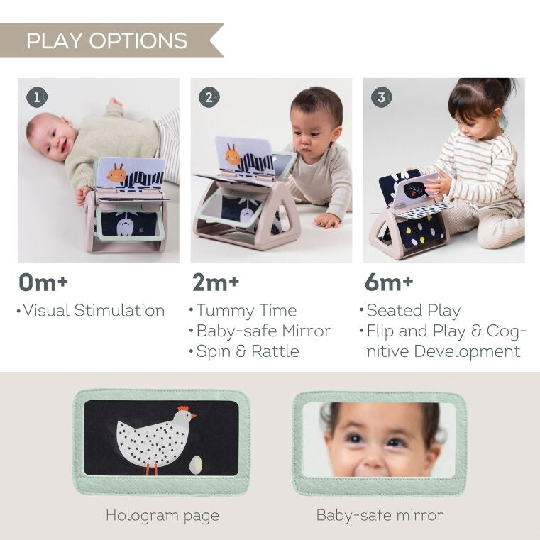 - A double-sided tummy-time spinning baby book for 3 developmental stages with 10 pages of black & white illustrations, 1 unique hologram page and a baby-safe mirror.