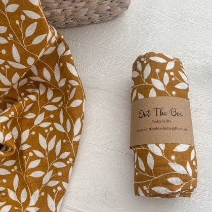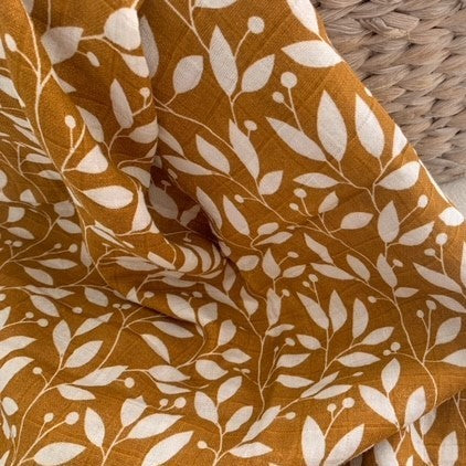The burnt orange swaddle is a large muslin swaddling wrap featuring a unique leaf print design.