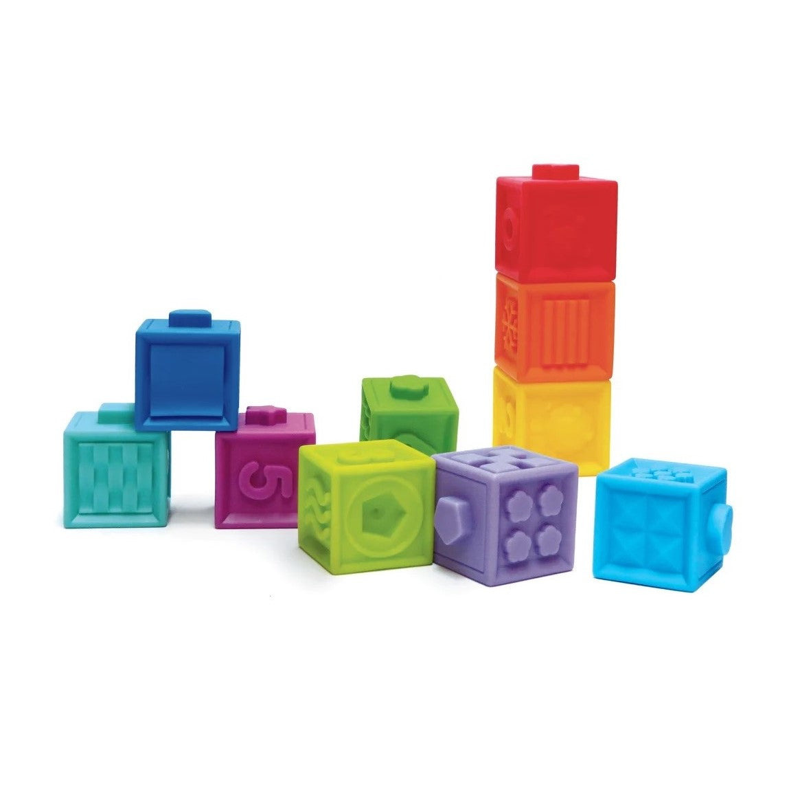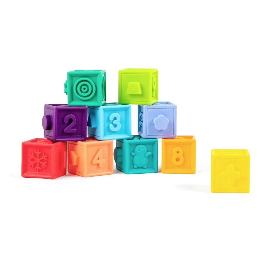 Introducing Edushape Textured Pop Blocks - A vibrant set of 10 interlinking and tactile cubes that offer a world of sensory exploration for your little one, suitable from birth.