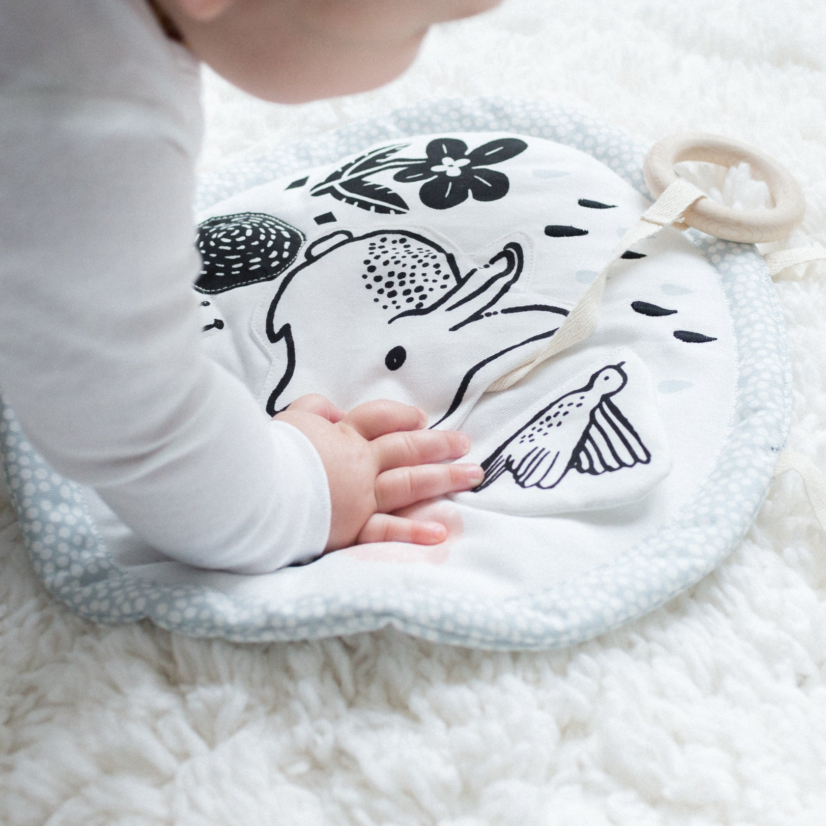 Keep your baby entertained and engaged with the Meadow Activity Pad. This delightful sensory play mat is designed to stimulate your baby's senses with high contrast graphics and hidden features, including crinkly textures, a rattle, a squeak, and a maple wood teething ring concealed behind a cute bunny in a pocket.
