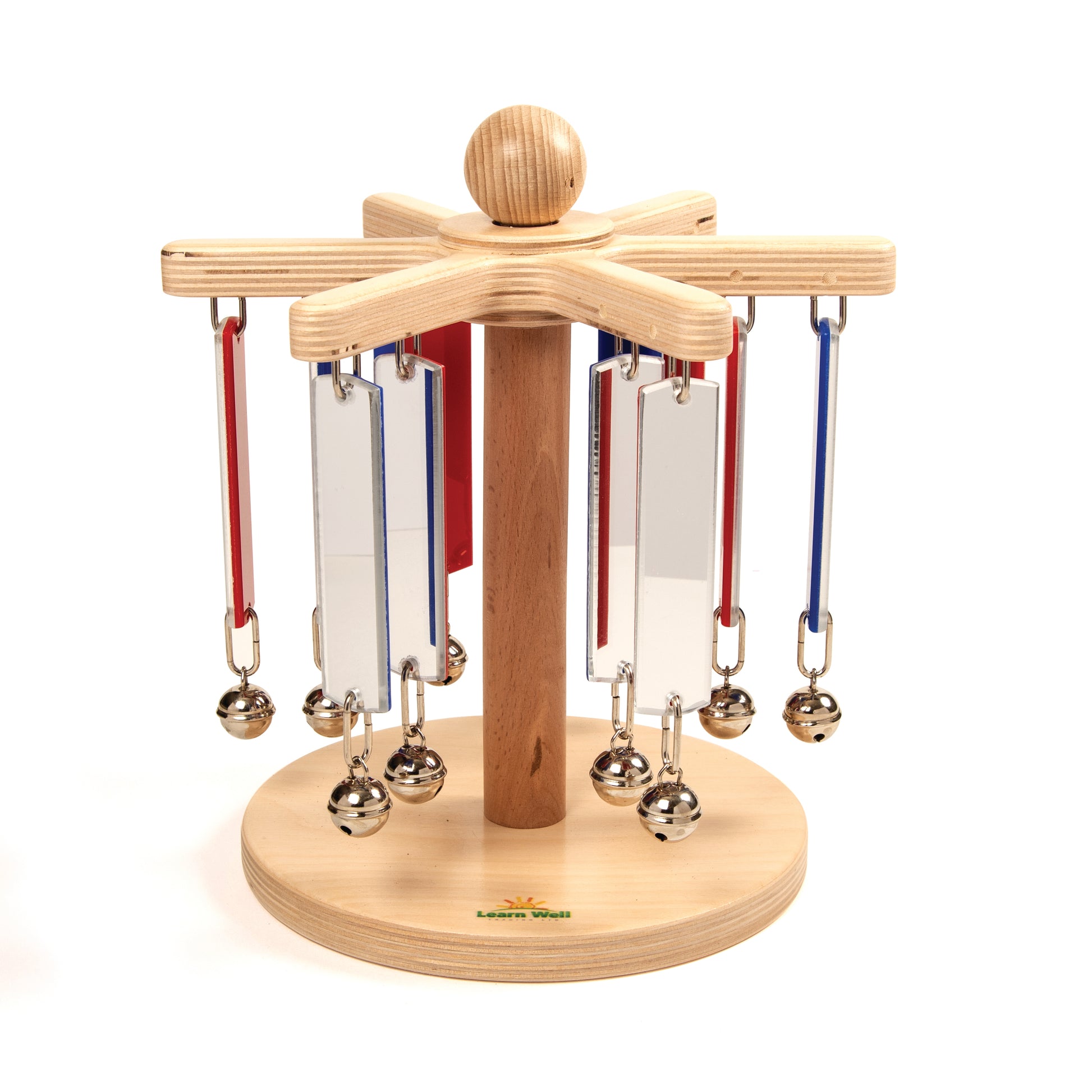 Introducing the ever-popular Mirror Chimeabout - An enchanting and multi-sensory wonder that promises endless fascination. This captivating toy features 12 hanging chimes that gracefully move outward as the Chimeabout hub is spun. Attached to these chimes are delightful bells that produce pleasant chimes as they sway and dance. However, what truly sets the Mirror Chimeabout apart is its striking red, blue, and mirrored chimes.