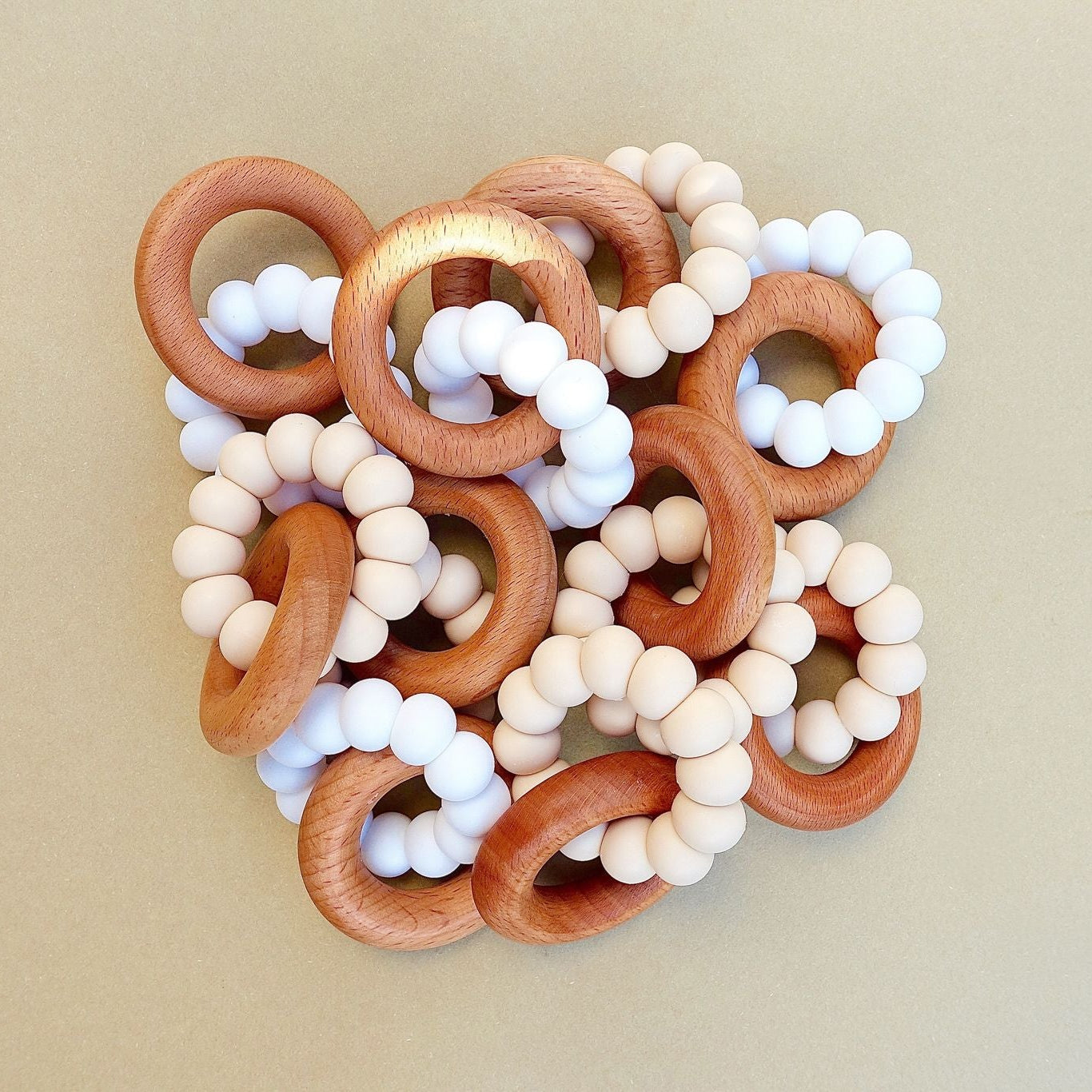 Dual Soothing Action: Our wood and silicone teething rings offer dual soothing benefits. The silicone beads are designed to soothe sore gums, while the wooden ring provides relief as your baby's little milk teeth begin to cut through.