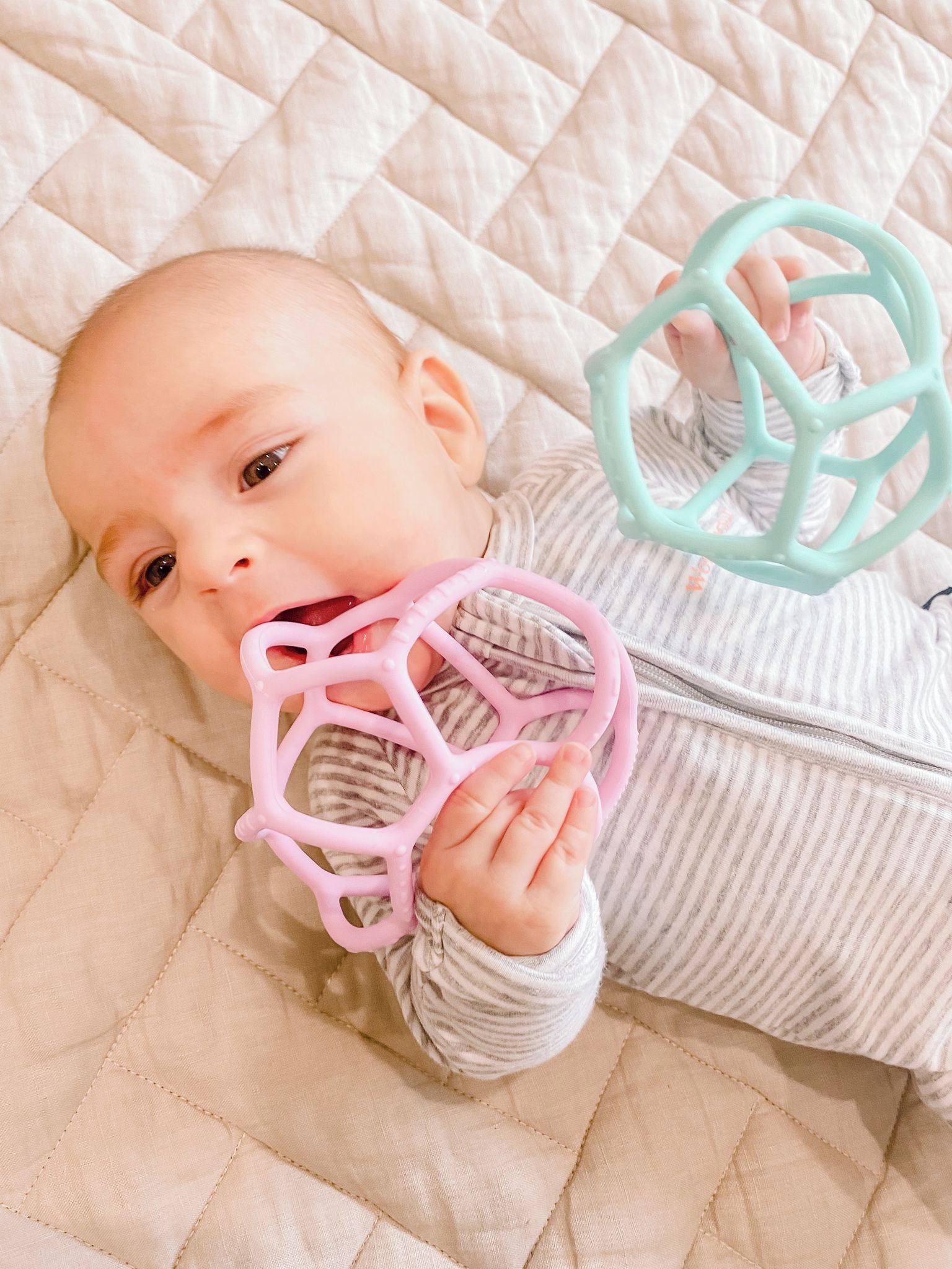 Meet the Sensory Ball.. part teether, part toy and perfect for every stage of your baby’s development. In a soft mint colour, this tactile silicone ball is perfect for little hands to grasp, squeeze, and explore.