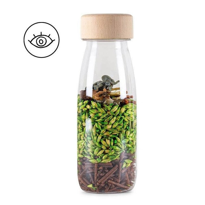 Step into the heart of the jungle with our Jungle Spy Sensory Bottle, a captivating toy designed to spark your child's imagination and curiosity. This special bottle creates a miniature jungle environment, making it a fantastic sensory toy for babies and toddlers.