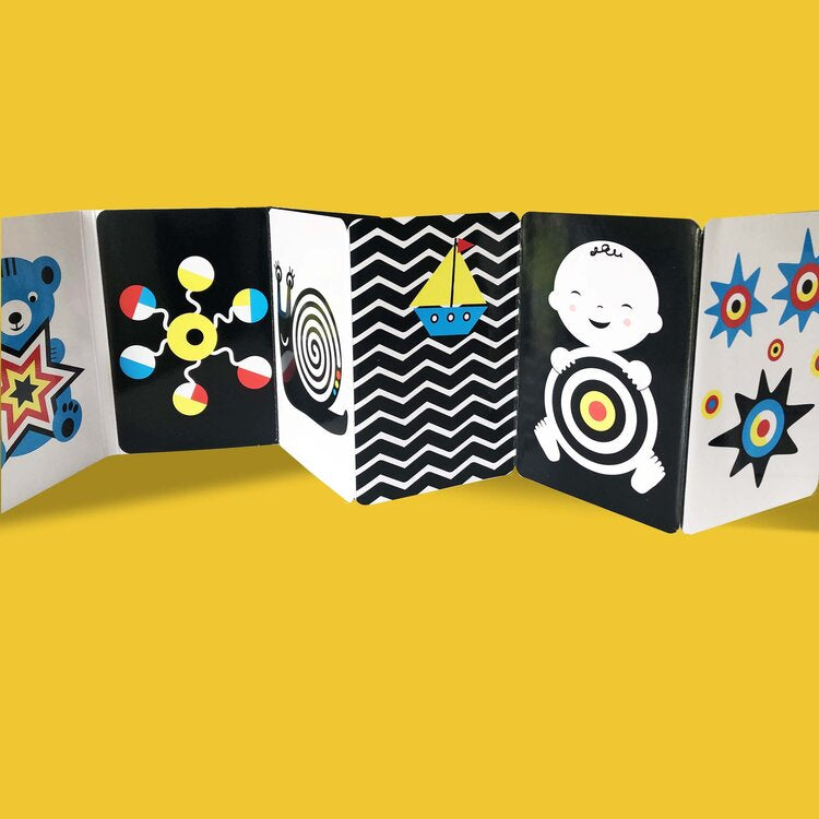 Here's a book to keep babies’ brains busy while their muscles are hard at work. It’s a double-sided panorama of images – high-contrast on one side, designed to attract babies’ attention, and photos of babies on the other, because babies love looking at other babies. There’s a mirror, too, so babies can look at themselves!