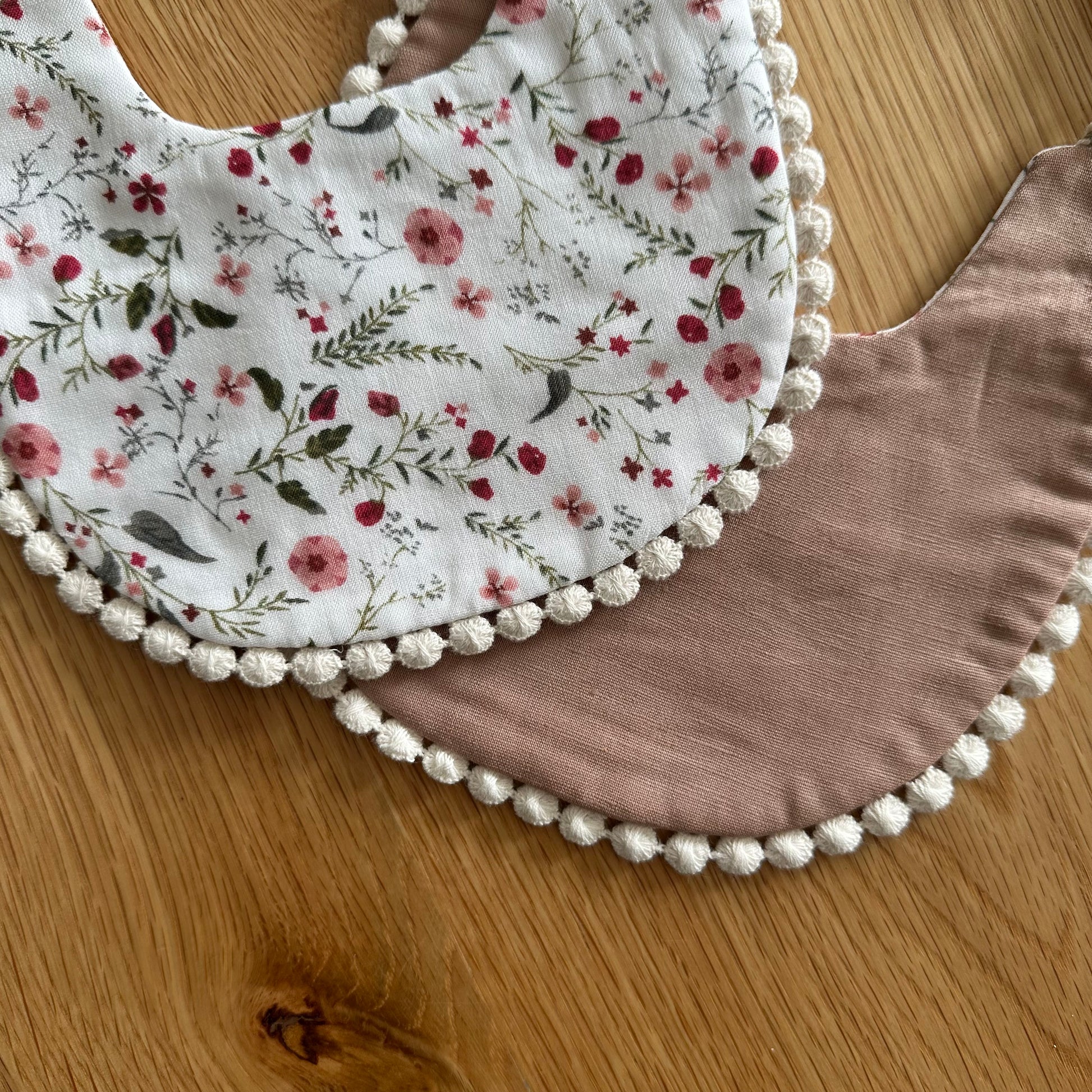 Add a touch of style to dribble time with these vintage feel bibs, complete with a cute pom pom trim.